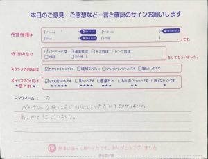 バッテリー交換にすぐに対応していただいて助かりました。