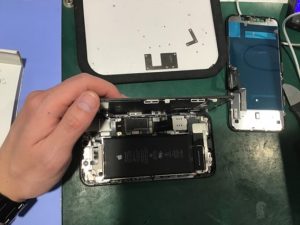 この時、画面を割らないようにしっかりと画面を温め、慎重に外していきます!画面が外せたら、端子を抑えているプレートを外し新しいバッテリーをiPhoneに取り付けます。